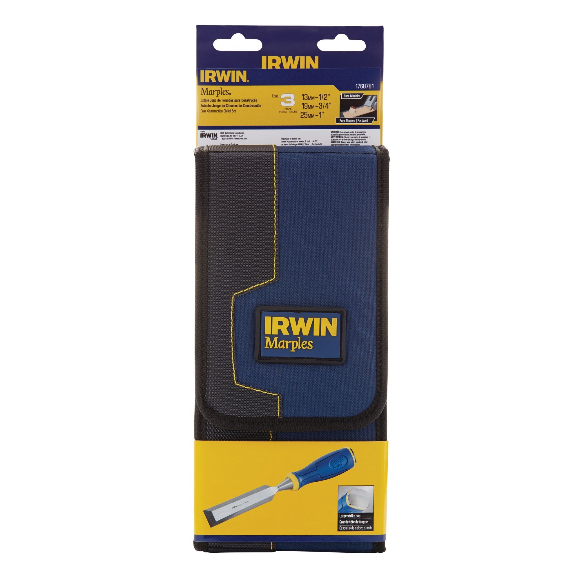 IRWIN MARPLES BEVEL EDGE CHISEL SET 3 PIECEThis three-piece Irwin Marples chisel set includes 1/2", 3/4", and 1" bevel edge chisels, covering the most common woodworking sizes. Each chisel features a solid-forged chrome vanadium steel blade hardened to 58-61 RC for superior edge retention, paired with a ProTouch ergonomic handle and steel strike cap.