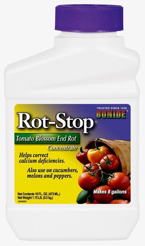 Use Bonide Rot-Stop Tomato Blossom End Rot to provide the nutritional calcium needed for developing fruit or after periods of heavy rain. Bonide Rot-Stop Tomato Blossom End Rot can be used on tomatoes, peppers, melons, cucumbers, and other listed vegetables.