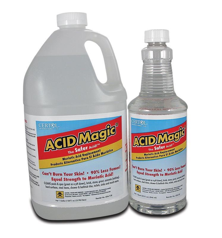 ACID Magic is a full strength muriatic- based product formulated to ship, use, and store easier than standard muriatic acid. ACID Magic cleans, clarifies, and etches like full strength muriatic acid.