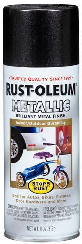 The RustOleum Stops Rust 11 oz. Metallic Spray Paint has a formula that helps prevent rust and can be used on automobiles, bikes and fixtures. This paint provides a rich metallic color for your projects. This paint contains weather-resistant metallic flakes and provides rust protection for heavily used objects.