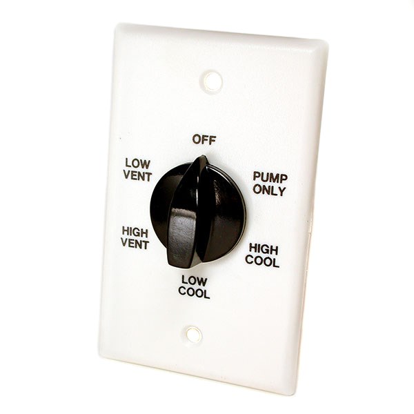 DIAL 2-SPEED WALL SWITCH FOR EVAPORATIVE COOLERSThe Dial Manufacturing Model 7110 two-speed wall switch provides direct wall-mount control of single and two-speed evaporative cooler motors. Featuring a UL recognized rotary switch and standard 6-position plate, it replaces most factory cooler switches and supports motors from 1/3 HP up to 1 HP - making it a reliable upgrade or replacement for swamp cooler installations.