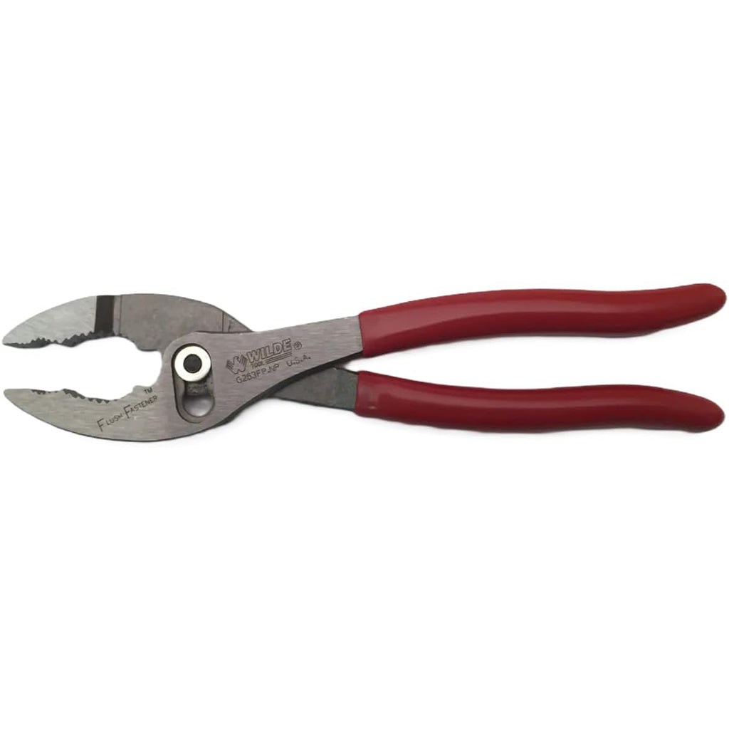 WILDE FLUSH FASTENER SLIP JOINT PLIERS - 8"Durable nickel chromium steel slip joint pliers with machined jaws for maximum gripping strength. Features Wilde's exclusive Flush Fastener nut and bolt system and Lobster Claw jaw design.