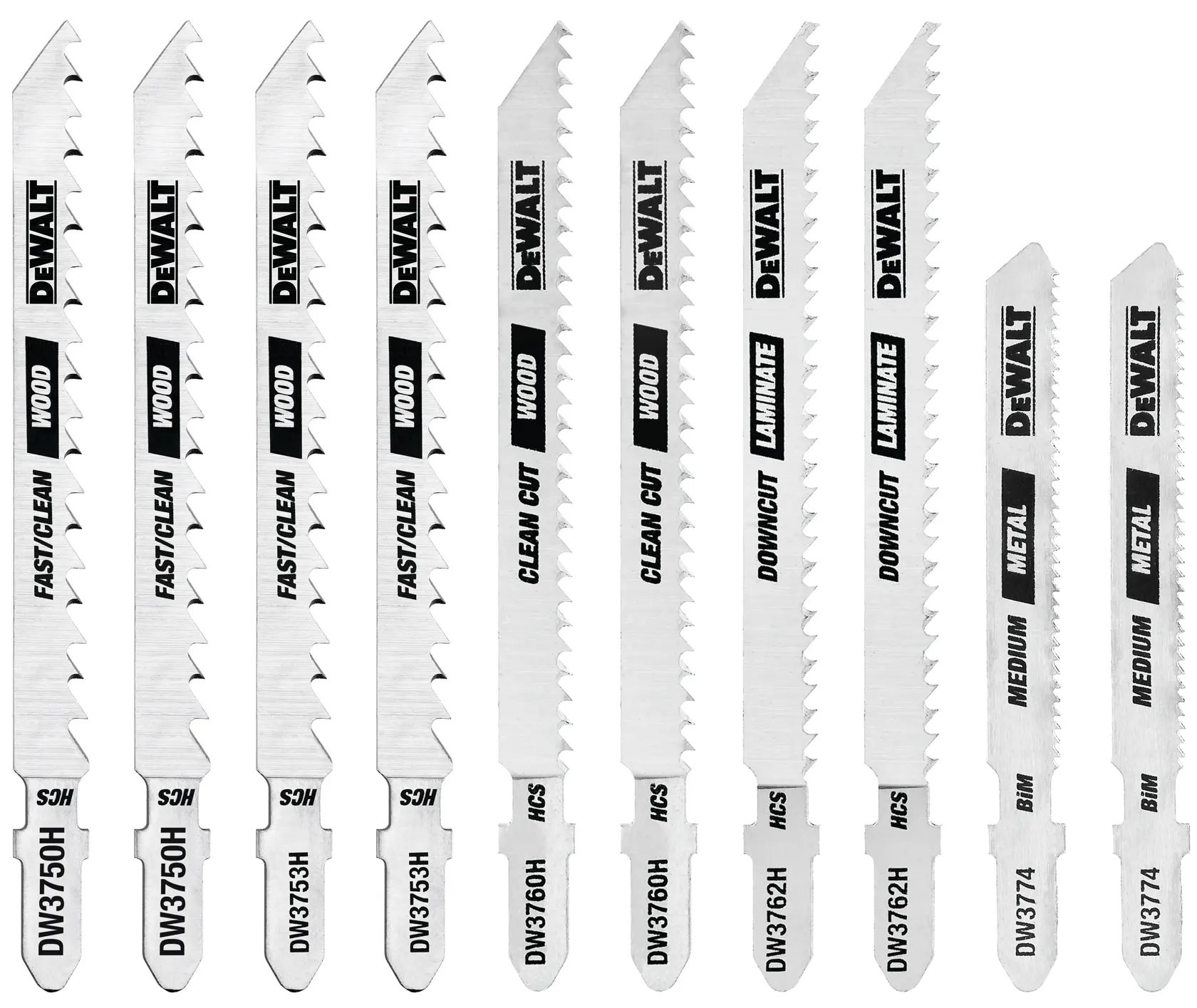 The DEWALT DW3741C T-Shank Jig Saw Blade Set provides a ready assortment of blades for cutting wood and metal. All blades feature T-shank fitment compatible with DEWALT, Bosch, and most other T-shank jig saws. The set includes 6 TPI HCS blades (4 in. long) for fast wood cuts, 10 TPI HCS blades (4 in. long) for general wood cutting, and 18 TPI bi-metal blades (3 in. long) for metal cutting. Includes a storage case for organized transport and storage.