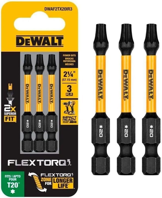 DEWALT FLEXTORQ IMPACT SCREWDRIVING BIT - T20, 3-PACKEngineered for use with impact drivers, this FlexTorq bit features a flex zone that absorbs impact energy to extend bit life up to 200X longer than standard bits.