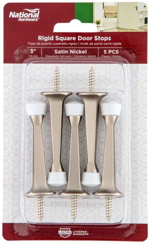 NATIONAL HARDWARE RIGID SQUARE DOOR STOP - 3" SATIN NICKELProtect your walls and molding from door damage with this zinc die-cast rigid door stop. The surface-mount design installs easily on baseboards with the included mounting hardware.