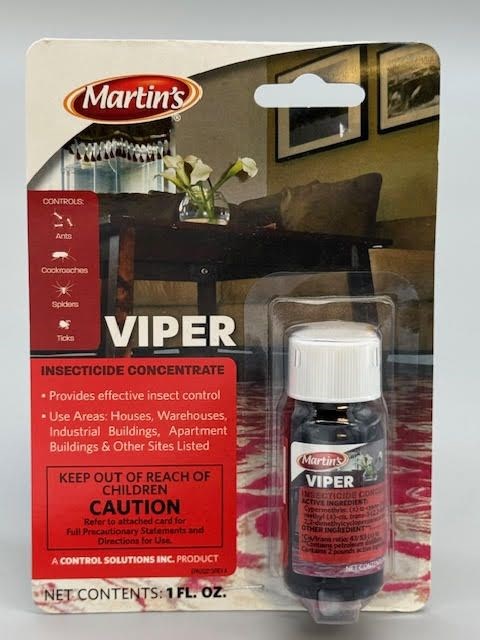 MARTIN'S VIPER INSECTICIDE CONCENTRATE - 1 OZMartin's Viper is a professional-grade emulsifiable concentrate with 25.4% Cypermethrin for long-lasting residual control of a wide range of pests. This 1 oz bottle is ideal for spot treatments and smaller applications, mixing with water at recommended dilution rates.