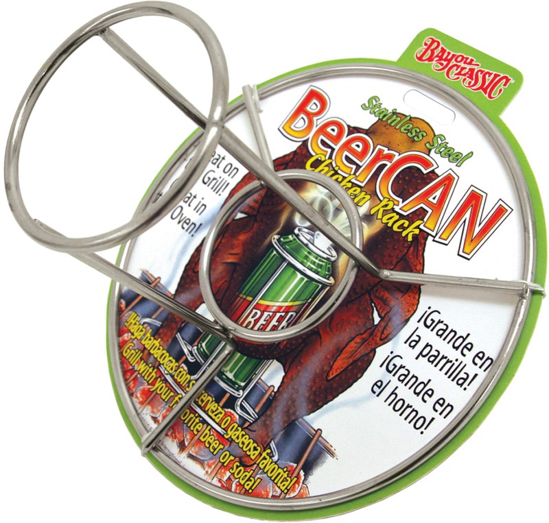 Get ready for some serious goooood eatin' !! This stainless-steel rack from Bayou Classic lets you cook a chicken via the beer can method with less worry about the hot can spilling or getting knocked over. It is designed to hold 12 oz. aluminum cans with your favorite beer, soda (Coca Cola Chicken is yummy!), juice, or water with herbs to fill your chicken with the flavor your taste buds desire. A 12-ounce can fits securely in the stand's center (which protrudes into the bird's cavity), while the circular wire base spans a wire grill more securely than individual "feet" and supports a chicken up to four pounds in weight. The chicken can be cooked on this rack in a variety of ways: on a charcoal grill, gas grill, or inside an oven. Reusable and dishwasher-safe.