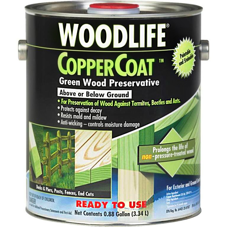 Use Woodlife CopperCoatâ„¢ green wood preservative on below-ground, ground contact or water contact wood installations (especially non-pressure-treated lumber) to protect the structural integrity. Prevents termite and other insect attack, mold, mildew and other fungi attack, and dimensional change caused by water absorption.