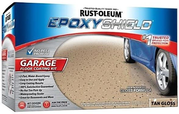 Rust-Oleum EPOXY SHIELD Garage Floor Coating creates showroom-quality surfaces. Protects against gasoline, antifreeze, motor oil, salt and hot tire pick-up. Kit includes 2-part water-based epoxy coating, concentrated cleaner, decorative chips, stir stick, detailed instructions and an instructional video.