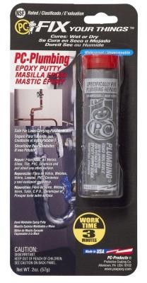 PC-Plumbing™ is a hand moldable putty epoxy designed for quick emergency-type repairs. PC-Plumbing™ is NSF® rated safe for contact with potable water. PC-Plumbing™ can be applied to wet and dry surfaces. Cut, mix and apply. PC-Plumbing™ allows a working time of about 3 minutes and cures for service in 60 minutes.