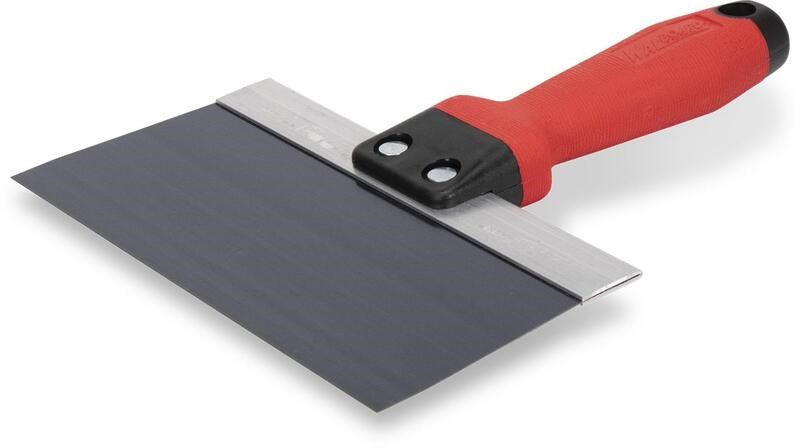 MARSHALLTOWN 8" BLUE STEEL TAPING KNIFEProfessional drywall taping knife with a 1095 blue spring steel blade for superior wear resistance and consistent flex during taping, mudding, and joint compound application. The 8" width is ideal for embedding tape, filling screw holes, and applying thin coats. Tuff-Grip handle provides a non-slip textured surface for comfort and control.