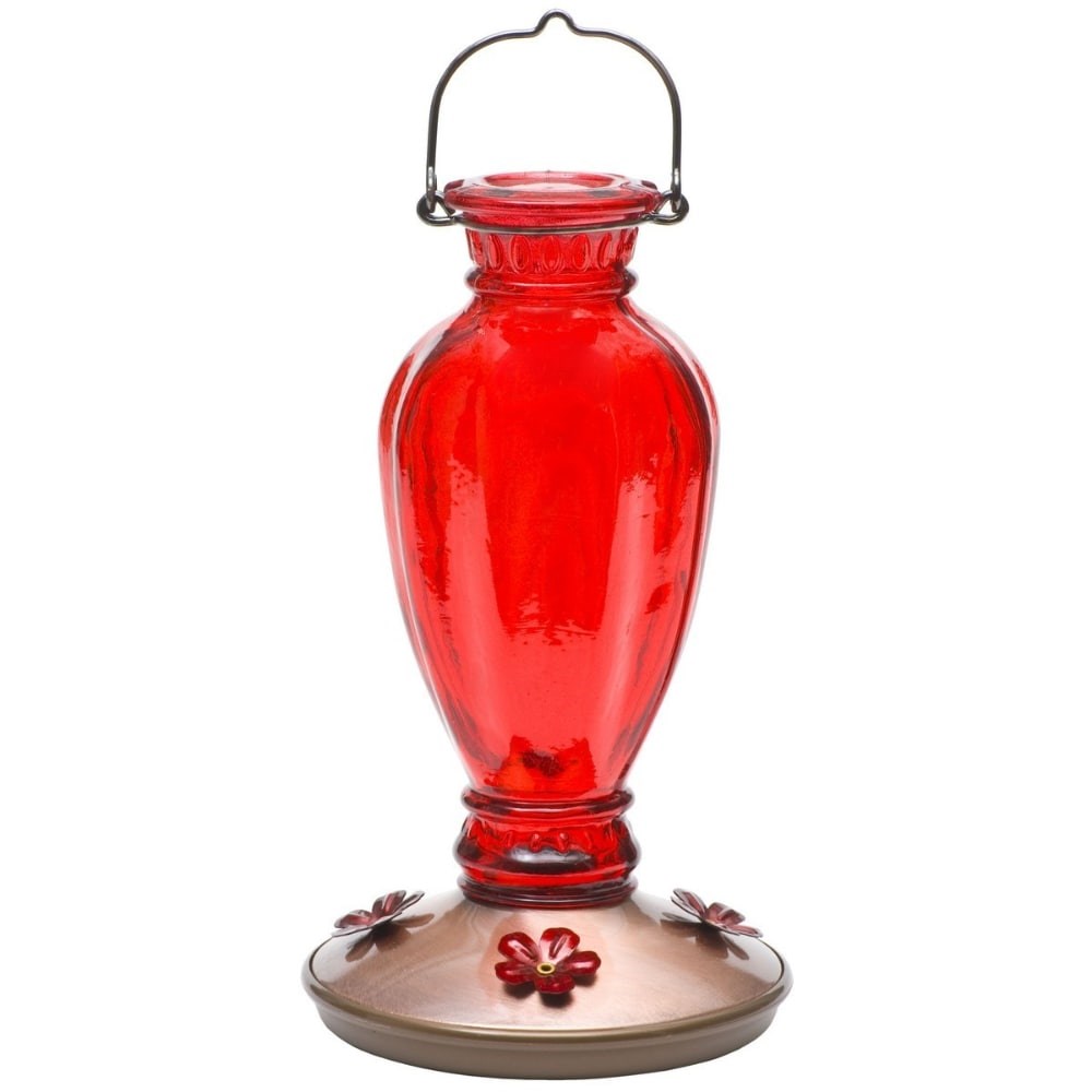 DAISY VASE VINTAGE GLASS HUMMINGBIRD FEEDER - 18 OZCharming vintage-style glass hummingbird feeder with a red luster finish that naturally attracts hummingbirds. The wide-mouth glass bottle makes filling and cleaning easy, and the snap-apart base allows thorough access for maintenance. Copper-finish hanging loop adds an elegant touch.