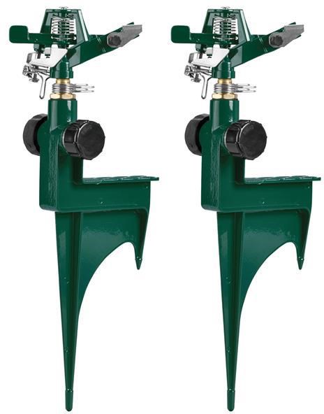 The Zinc Impact Sprinkler Head on Zinc Step Spike is designed to be used either as a single sprinkler or connected in a series. It is completely adjustable to cover a diameter of up to 80 ft. making it ideal for large yards. It can be adjusted from a partial to full circle. Both the head and the spike are made of durable zinc. The spike is easily anchored in place around the lawn.