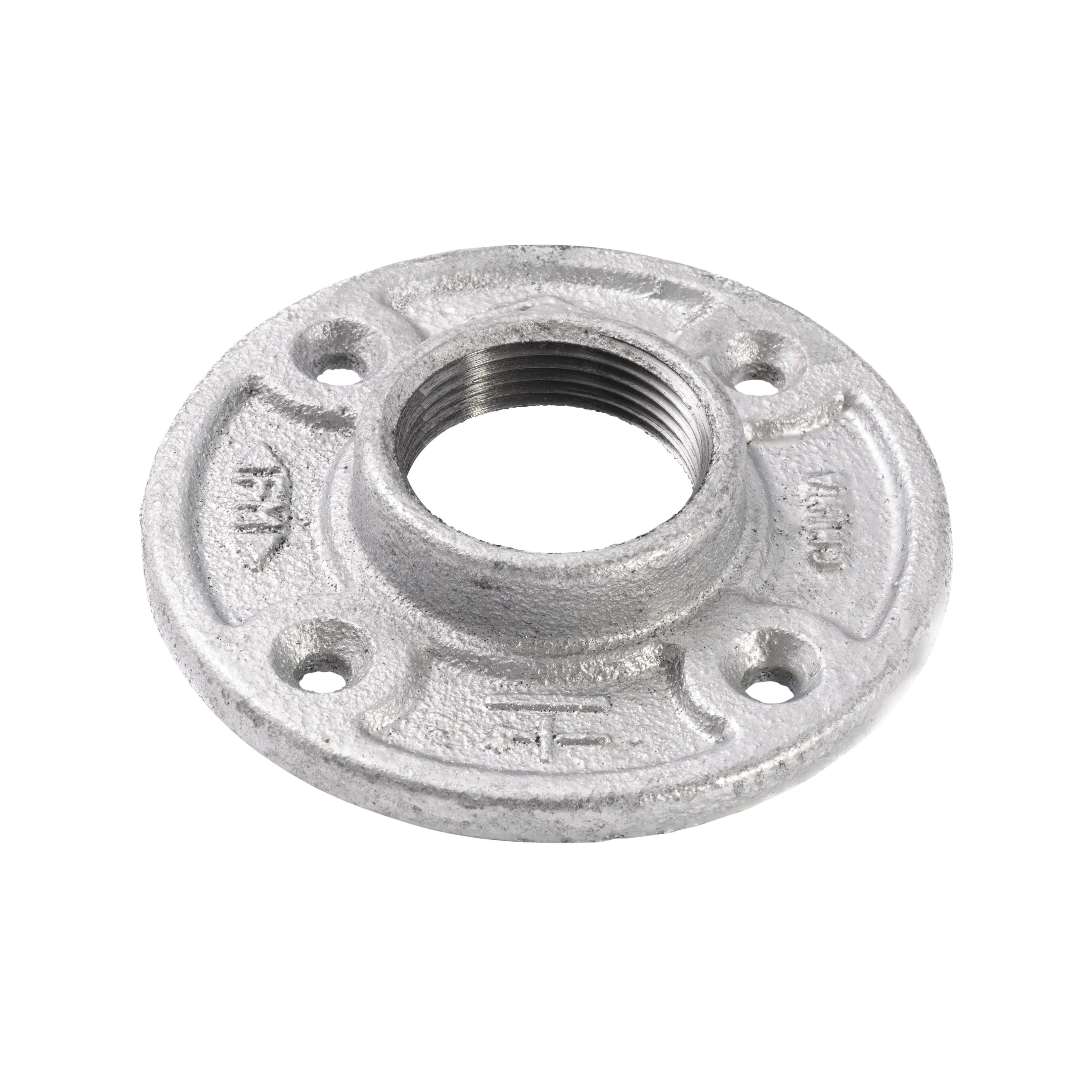 ANVIL/MUELLER MALLEABLE IRON FLOOR FLANGE - 1-1/4", GALVANIZEDThe Anvil/Mueller Malleable Iron Floor Flange secures 1-1/4" pipe to floors, walls, or ceilings with a strong, corrosion-resistant connection. The galvanized finish protects against rust in exposed and damp environments. Four screw holes in the base flange provide solid mounting to wood or concrete surfaces.