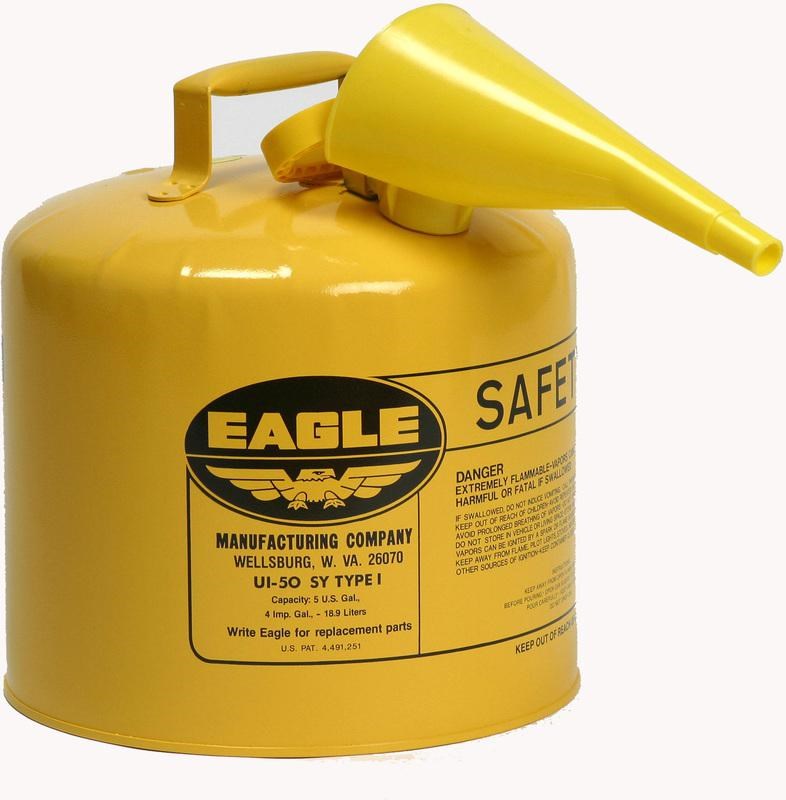 Eagle 5 gallon Type I yellow safety cans are constructed of 24-gauge hot dipped galvanized steel, are the only deep drawn seamless can made, have a double interlock no-weld bottom seam, a baked on powder coat finish with a trilingual label, have a spring closing lid with neoprene gasket that vents at 5 psi internal pressure, have a non-sparking flame arrestor and pour spout and are 100 percent made in the USA.