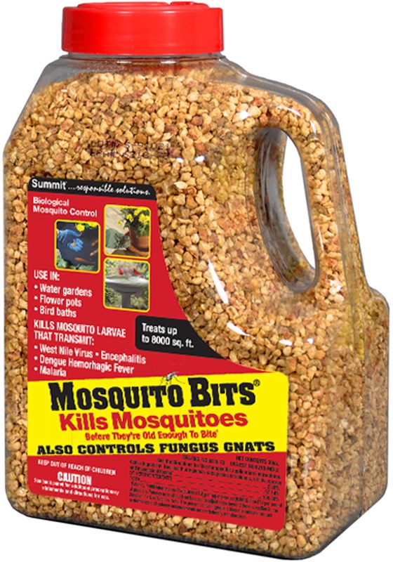 Marshy swampy areas inundated with larvae? Sprinkle some Mosquito Bits Quick Kill as a shock. Corn cob granules coated in Bti, the Bits do not last long but provide a punch that will turn water, black with larvae, to a clear pool void of future mosquitoes. After the initial use as a "shock," supplement with Mosquito Dunks for long term control.