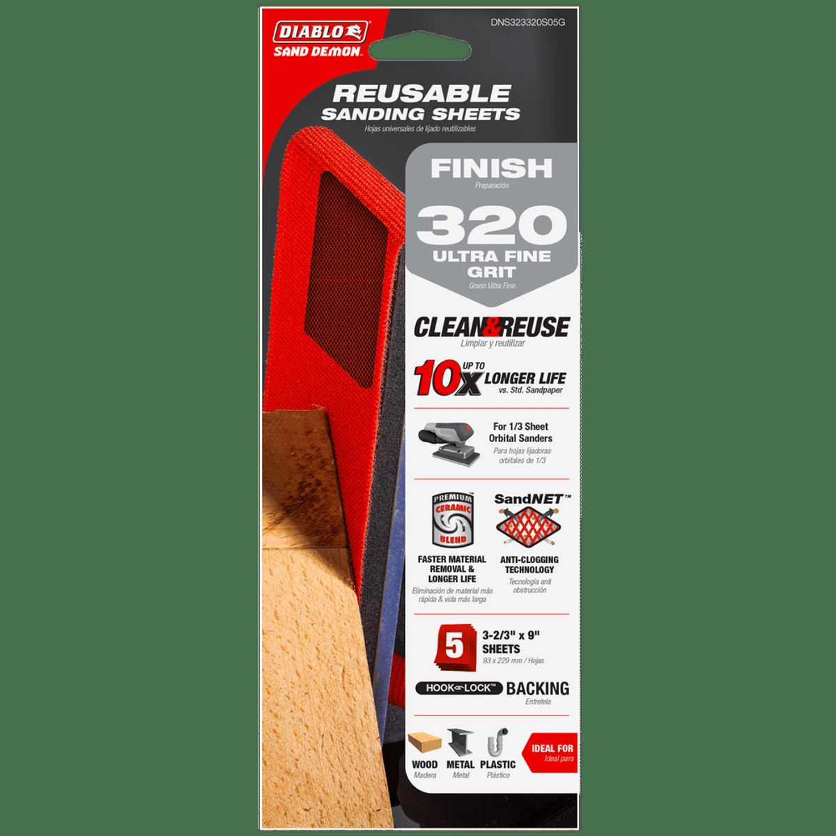 DIABLO SAND DEMON 1/3 SHEET REUSABLE SANDING SHEET - 320 GRIT (ULTRA FINE), 5-PACKDiablo Sand Demon reusable sanding sheets deliver up to 10X the life of standard sandpaper, so 5 sheets replace up to 50 conventional sheets. The advanced SandNET open-net design resists clogging for superior dust extraction and longer cutting life. Simply shake, vacuum, or rinse to clean and reuse.