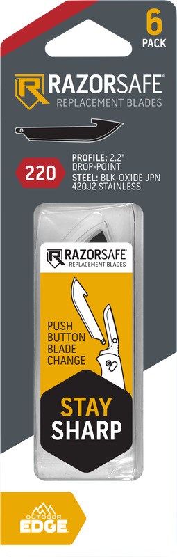 OUTDOOR EDGE RAZORSAFE DROP POINT BLADE, BLACK - 2.2", 6 PACKKeep your Outdoor Edge RazorMini knife razor sharp with genuine RazorSafe replacement blades. Each drop point blade is crafted from Japanese 420J2 stainless steel, precisely heat-treated for excellent edge retention and hand-finished to a shaving-sharp edge. The black oxide finish provides added corrosion resistance.