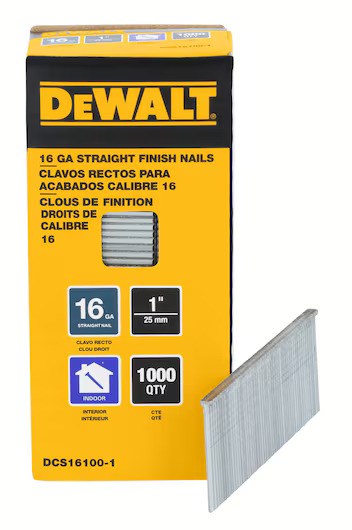 DEWALT 16-GAUGE STRAIGHT FINISH NAILS - 1"DeWalt DCS16 series 16-gauge straight finish nails are designed for interior trim and finish work. Made from galvanized carbon steel with a chisel point for reduced material splitting, these nails deliver consistent drivability in 16-gauge straight finish nailers.