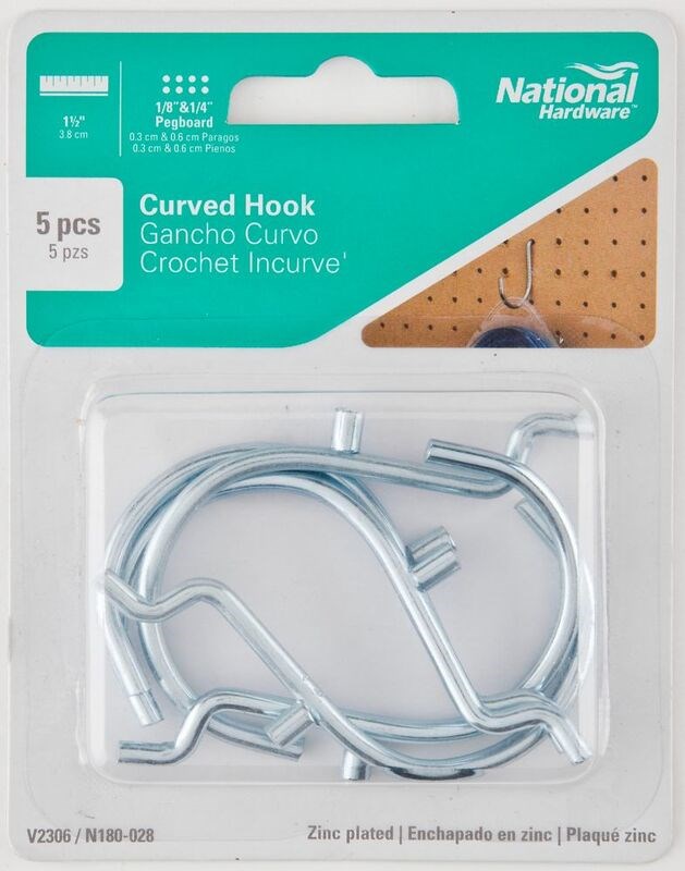 NATIONAL V2306 CURVED PEGBOARD HOOK - 1-1/2"These curved pegboard hooks are built to hang small tools and accessories in the garage or workshop. The locking design keeps items securely in place, while the zinc-plated steel construction resists rust in shop environments. Each pack includes 5 hooks.