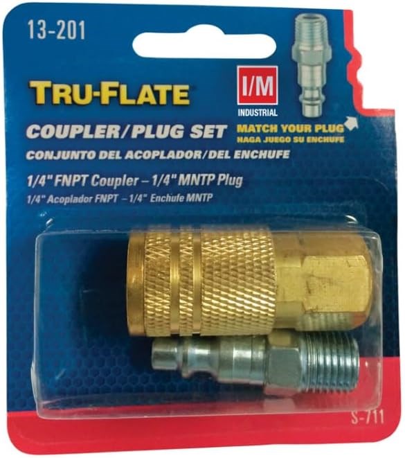 TRU-FLATE I/M STYLE COUPLER AND PLUG SETQuick-connect your air tools with this Tru-Flate 13-201 coupler and plug set in the I/M (Industrial/Milton) design, the most common air fitting standard in North America. The set includes a 1/4" FNPT coupler and 1/4" MNPT plug for fast, secure air line connections.