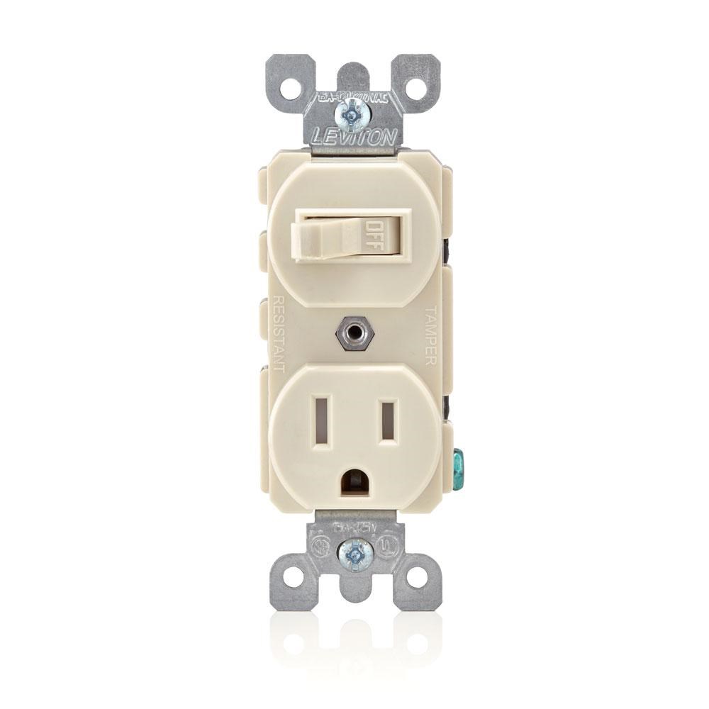 LEVITON COMBINATION SWITCH AND TAMPER RESISTANT OUTLET, IVORYThis Leviton T5225 combination device puts a toggle switch and a tamper resistant outlet in a single-gang space, saving room in your electrical box. The tamper resistant receptacle meets NEC code requirements for child safety with a built-in shutter mechanism.