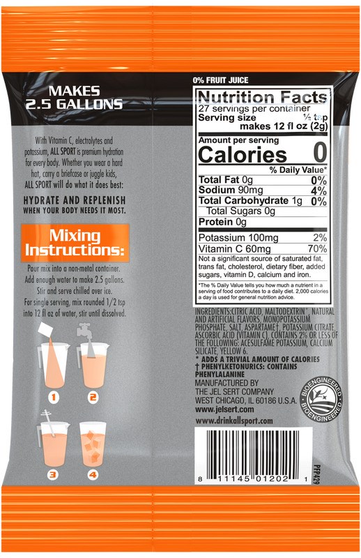 ALL SPORT ZERO SUGAR-FREE ELECTROLYTE POWDER - ORANGE, 2.5 GALLONAll Sport Zero sugar-free electrolyte drink powder in classic orange flavor. Each pouch makes 2.5 gallons of hydrating, zero-sugar sports drink packed with electrolytes, potassium, and Vitamin C - all the hydration benefits without the sugar.