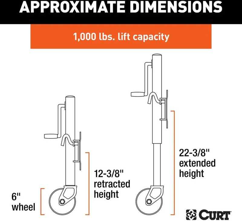 CURT MARINE TRAILER JACK WITH 6" WHEELMake boat trailer coupling easier with this CURT marine jack designed specifically for marine applications. The 6-inch wheel allows for greater mobility when maneuvering your trailer, while the zinc finish provides excellent corrosion protection in wet environments.