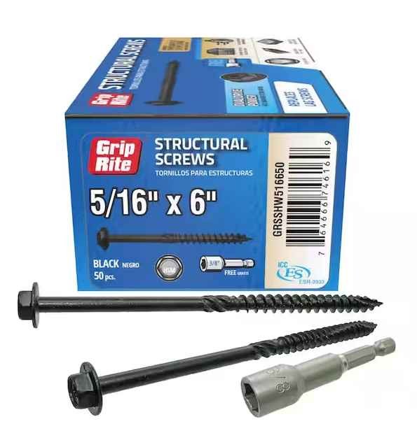 Replace lag screws with the Grip Rite PrimeGuard Plus Hex Washer Head Structural Screw. This 5/16" x 6" screw features a dual-drive hex washer head that accepts both a 3/8" hex driver and a T-25 star bit, giving you flexibility on the jobsite. The Type 17 self-drilling point cuts into wood without pre-drilling, speeding up installation.