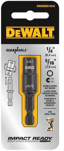 DEWALT DOUBLE ENDED DETACHABLE NUT DRIVERSwitch between 1/4" and 5/16" hex sizes without changing bits using this double-ended nut driver from DeWalt. The detachable design allows easy cleaning, while an industrial-strength magnet provides maximum fastener retention during driving.
