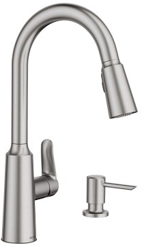 This transitional Moen faucet brings a sleek, striking look like no other, making it a perfect statement piece in the kitchen. Edwin features Moen's exclusive Spot Resist® stainless finish, Power Clean™ spray technology as well as Moen's Reflex™ system for easy and secure docking. It includes a two-function spray wand with rinse and spray modes as well as a coordinating soap dispenser for additional convenience