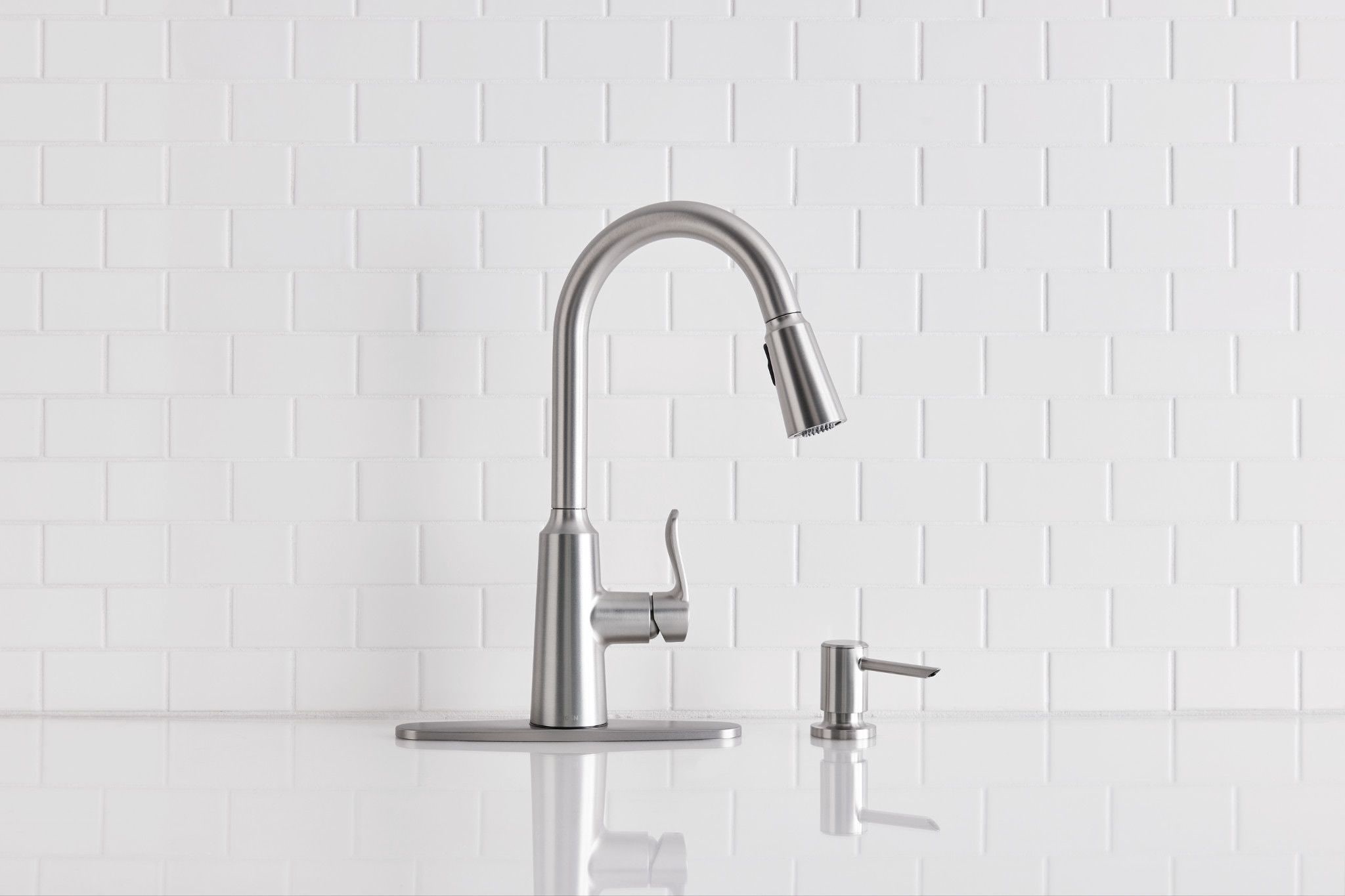 EDWYN STAINLESS 1-HANDLE HIGH ARC FAUCETThis transitional Moen faucet brings a sleek, striking look like no other, making it a perfect statement piece in the kitchen. Edwin features Moen's exclusive Spot Resist(R) stainless finish, Power Clean(TM) spray technology as well as Moen's Reflex(TM) system for easy and secure docking. It includes a two-function spray wand with rinse and spray modes as well as a coordinating soap dispenser for additional convenience.