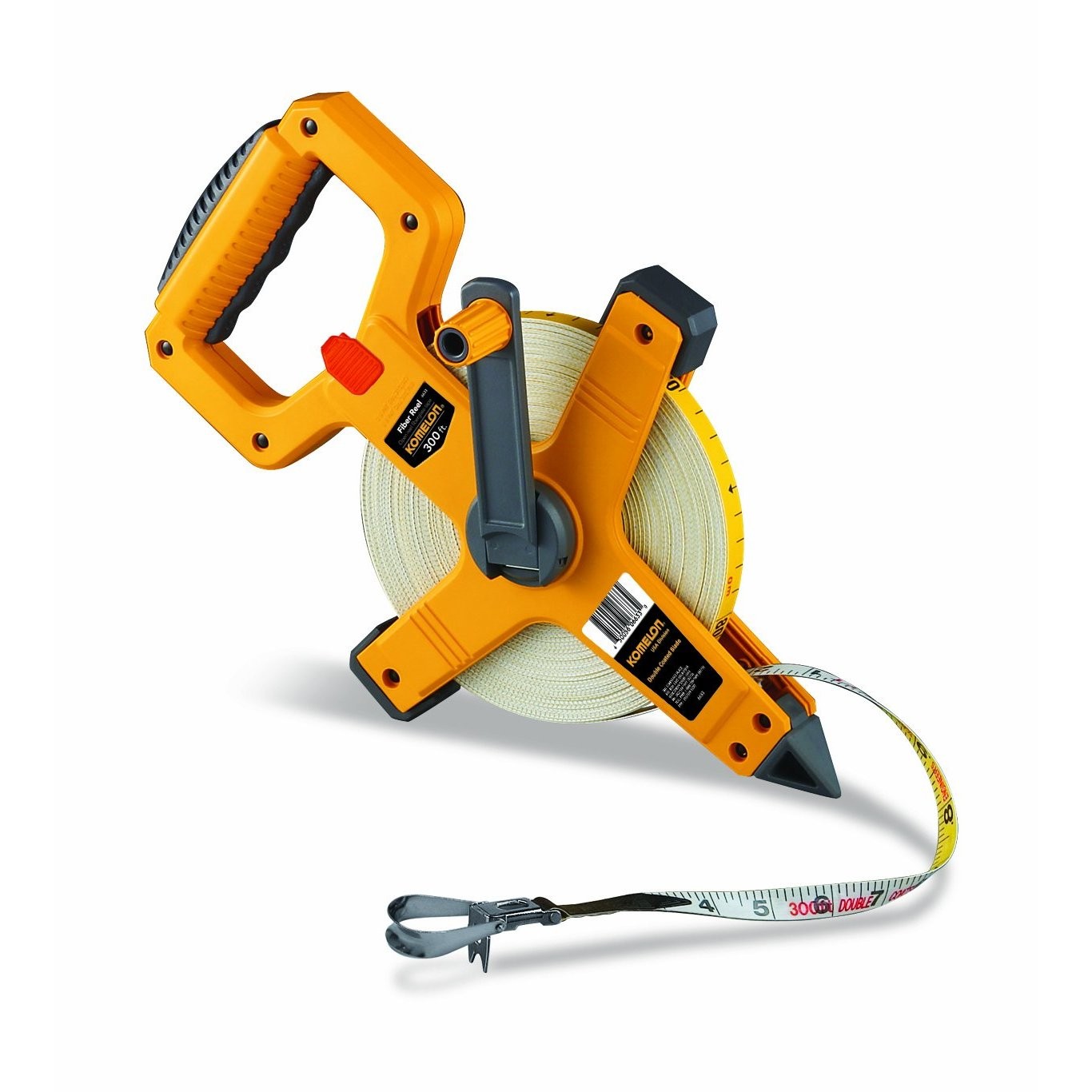 Komelon's open reel fiberglass tapes are perfect for all of your long measuring needs. The double coated fiberglass blade is waterproof and dirt resistant. The coating also protects the markings and graduations from chemical and mechanical abrasion. In addition to a heavy duty abs frame, this tape has a two color blade with double sided printing (engineer scale on back of blade) and a versatile ring end hook and claw. The 6633 is great on any jobsite or athletic field.