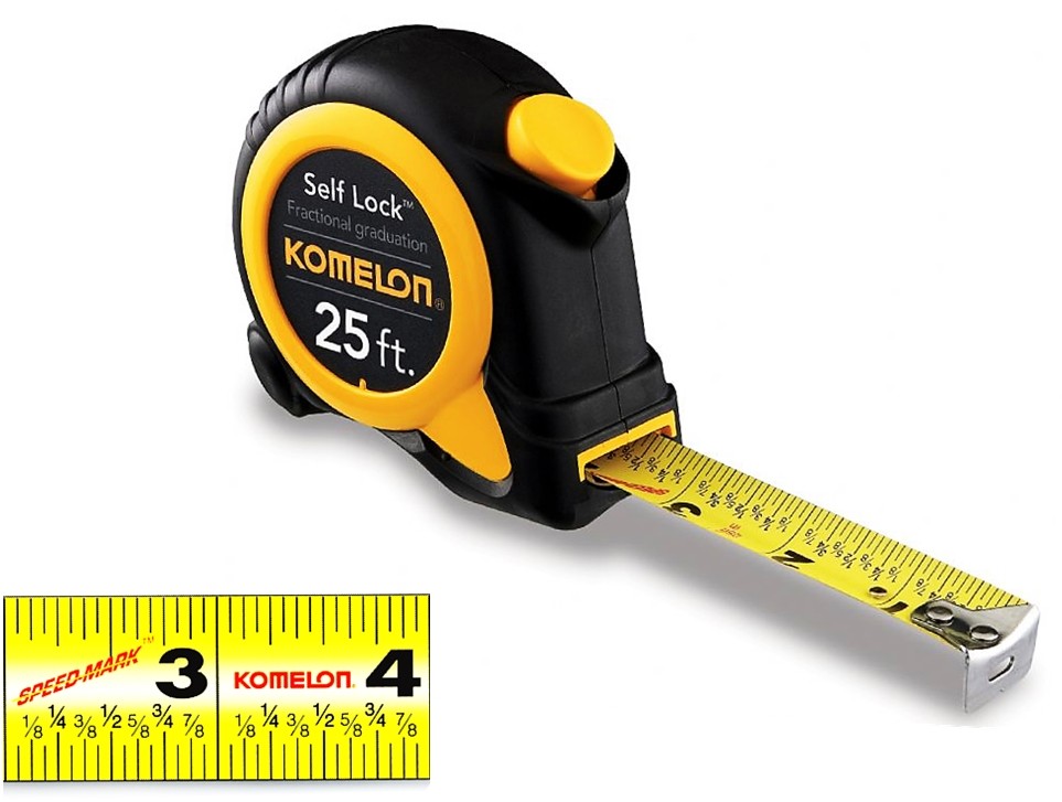 This 25' Self-Lock Speed Mark has a nylon coated blade with fractional graduations for easy read and accurate measurement. Komelon's yellow Self-Lock case is ergonomically designed for user comfort. Be careful! once you try the Self-Lock you may never use another.