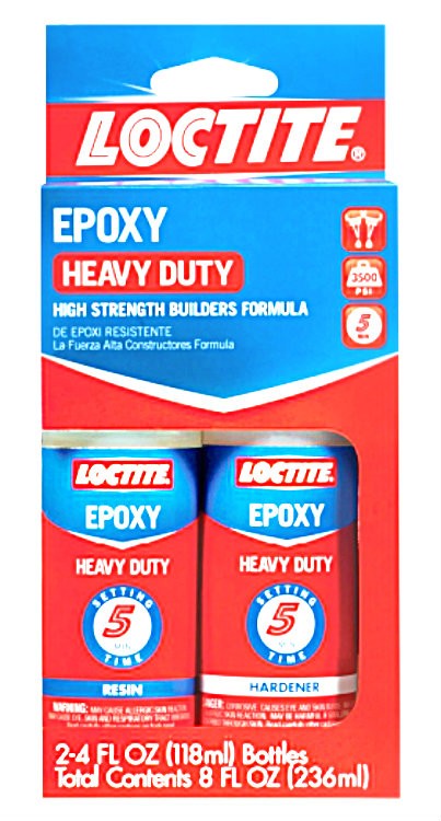 Loctite® Epoxy Heavy Duty is a two-part adhesive consisting of an epoxy resin and a hardener. When mixed in equal volumes, resin and hardener react to produce a tough, rigid, high strength bond in 5 minutes for most projects. It can be used as an adhesive for a wide range of materials or as a versatile filler for gap bonding, surface repairs and laminating.