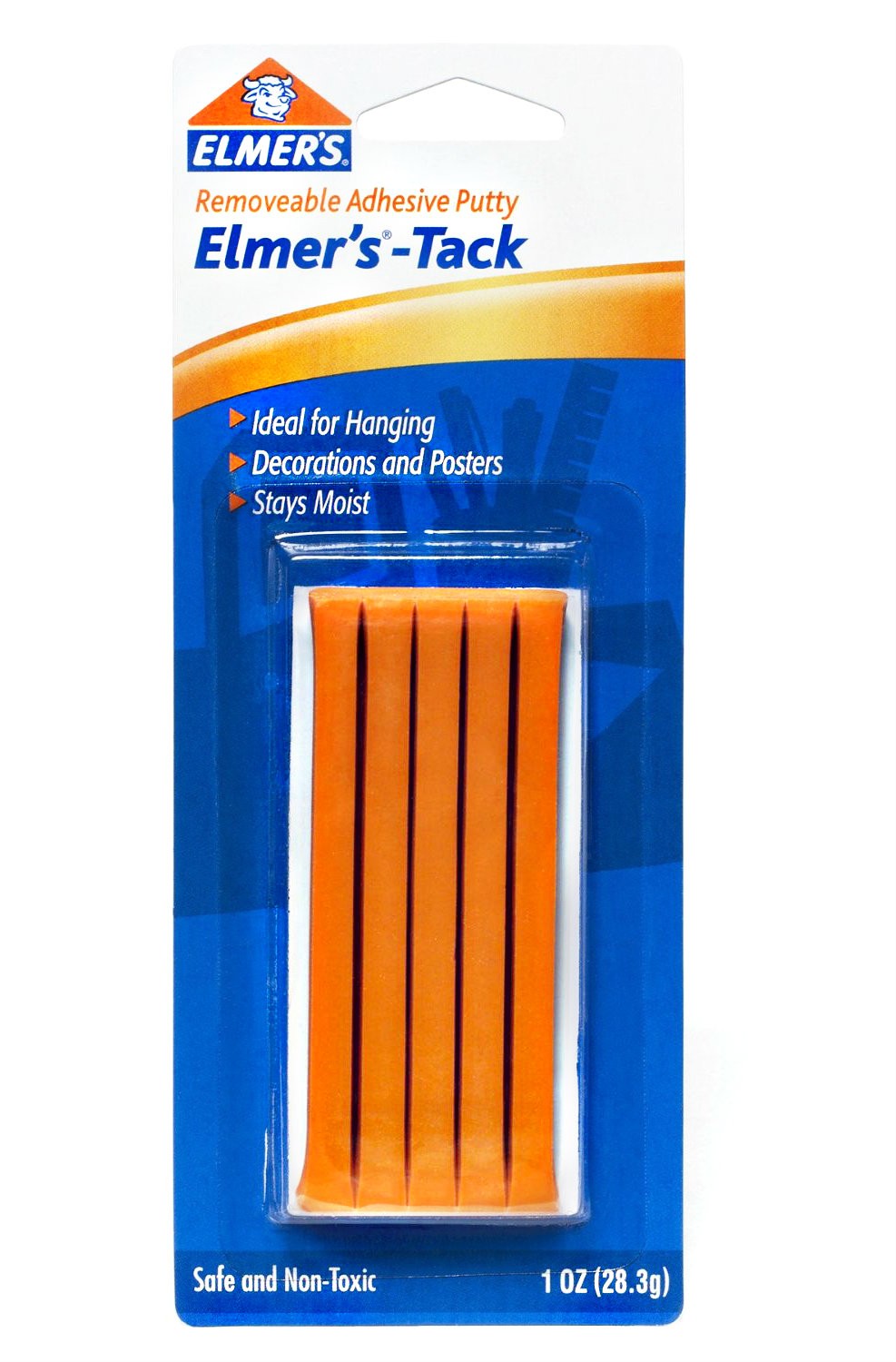 Elmer's tack is a removable adhesive putty. It is ideal for hanging light-weight objects to walls, doors, refrigerators, or similar non-porous surfaces. It is easy to use, stays moist and will not mar most surfaces. It can be removed and re-used.