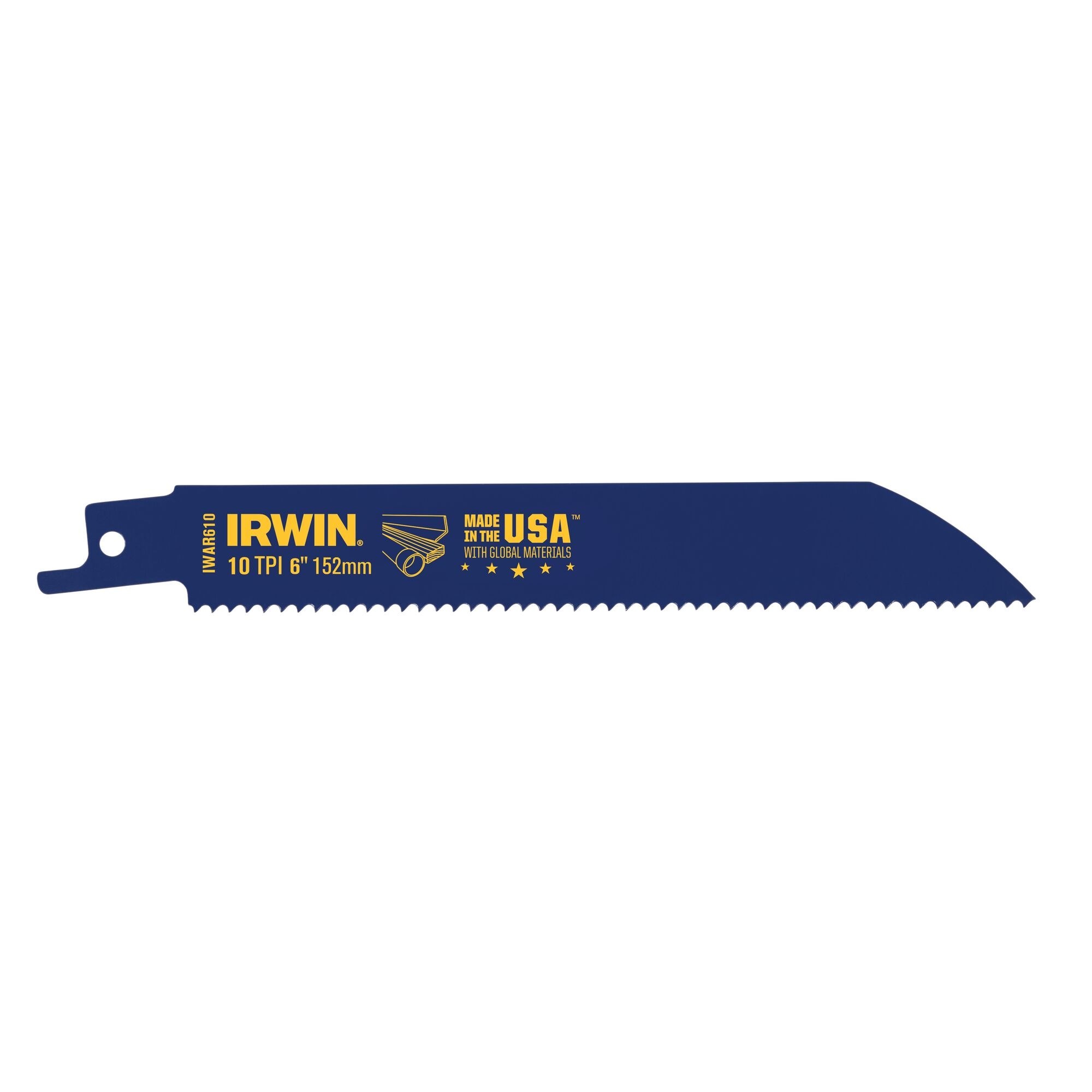 IRWIN WELDTEC 6" RECIPROCATING SAW BLADE - 10 TPIIdeal for cutting pipe, carbon steel, stainless steel, plastic, and composition materials, this 6" blade features 10 teeth per inch for versatile performance in materials 1/8" to 1/2" thick. Irwin WeldTec blades use bi-metal construction with 8% cobalt high-speed steel teeth for longer cutting life in demanding applications.