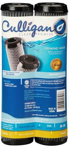 CULLIGAN D10 DRINKING WATER FILTER CARTRIDGEThe Culligan D10 replacement filter cartridge uses activated carbon-impregnated cellulose to remove chlorine, bad taste, and reduce odor from your drinking water. With 5-micron filtration and up to 3 months or 250 gallons of filter life, it provides clean, great-tasting water for your household.