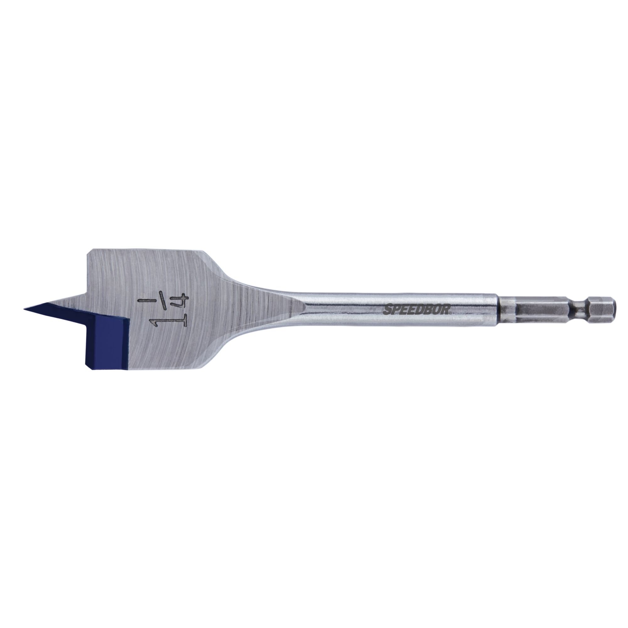 IRWIN SPEEDBOR WOOD SPADE BIT - 1-1/4"Drill clean, fast holes in wood with the Irwin Speedbor spade bit. The Blue-Groove point and cutting edge provide faster chip removal, drilling up to 4x faster than standard spade bits. Double cutting spurs scribe the outside of the hole before chips are made, reducing breakout and producing a smoother finish.