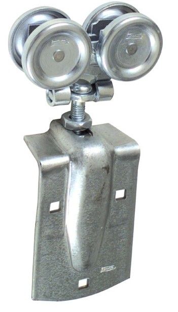 NATIONAL BOX RAIL HANGERDesigned for use with box rail on wood-frame sliding doors from 1- 1/2 inches to 2 inches thick. For use with rectangular box rails. Packed with two end caps and bolts for attaching door straps. Slot in top of door strap allows lateral and vertical adjustment. Durable one piece, precision formed steel. Each hardened axle has 12 hardened and precision-ground alloy steel roller-bearings. Delrin (tm) seals keep out dirt while holding in long-life grease. Safe Working Load - 300 lbs. per hanger.