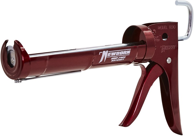 The Newborn 189D Drip-Free Super Ratchet Rod Cradle caulking gun has a steel half-barrel frame that fits 1/10-gal. cartridges and has a 6:1 thrust ratio for use with medium viscosity materials such as silicone. The ratchet-style pressure rod has teeth that hold the rod in place after each pull of the trigger. For thinner materials, this helps minimize drips. The rod retracts after each pull of the trigger, removing pressure from the tube, which also helps prevent dripping. There is a welded plate in the back for securing the cartridge in place. The hook on the back allows it to hang on a ladder, and a seal puncture tool and a spout cutter are built into the side of the gun for opening cartridges without a knife.