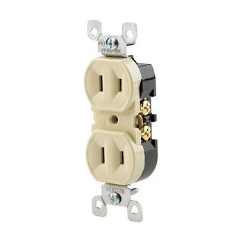 The Leviton 15 Amp 2-Wire Duplex Outlet in Ivory features a shallow design and break-off plaster ears for easy installation and a secure fit.