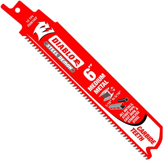 DIABLO STEEL DEMON CARBIDE RECIP SAW BLADE - 6", 10 TPI, 10PKDiablo's Steel Demon carbide-tipped reciprocating saw blades deliver superior performance when cutting medium-thickness metals from 1/16" to 5/16". High-performance TiCo Hi-Density carbide teeth provide clean, smooth finishes and significantly outlast standard bi-metal blades.