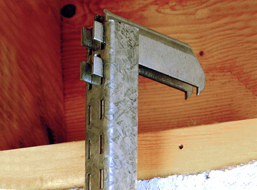 FAST MOUNT HEAVY DUTY MOUNTING HOOKThe Knape & Vogt CD-0104 Fast Mount Hook provides a simple, no-screws-needed solution for hanging shelving standards on basement walls. Designed for poured concrete or cinder block walls where studs are not accessible, this galvanized steel hook mounts over the wood top plate or header at the top of the wall to support FAST-MOUNT wall standards.