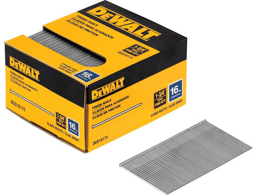 DEWALT 16-GAUGE STRAIGHT FINISH NAILS - 1-3/4"DeWalt DCS16 series 16-gauge straight finish nails are designed for interior trim and finish work. Made from galvanized carbon steel with a chisel point for reduced material splitting, these nails deliver consistent drivability in 16-gauge straight finish nailers.