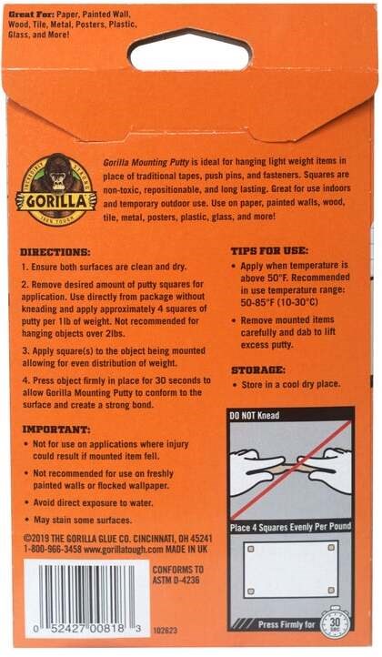 GORILLA MOUNTING PUTTY - 2 OZGorilla Mounting Putty is a removable, repositionable adhesive that holds up to 2 lbs without damaging walls. Pre-cut squares are ready to use straight from the package with no kneading required. A clean alternative to tapes, push pins, and nails.
