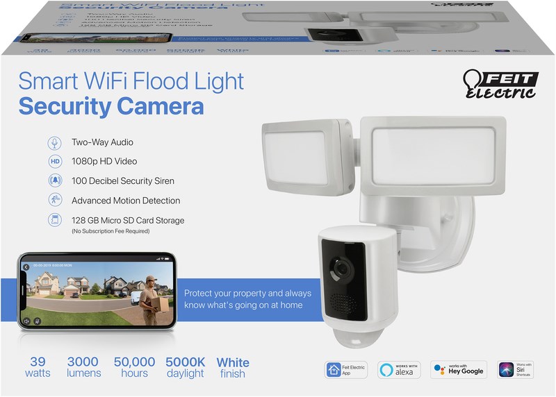 The Feit Electric Smart Floodlight Security Camera makes it easy to upgrade your exterior home lighting to a flexible home security system. Protect your property and always know what’s going on at home from any location using your smart mobile device. Feel empowered with powerful home security in the palm of your hands. Receive push notifications when activity is detected within the 32-foot, 270-degree detection range. Capture, playback and share video and still recordings on your mobile device.