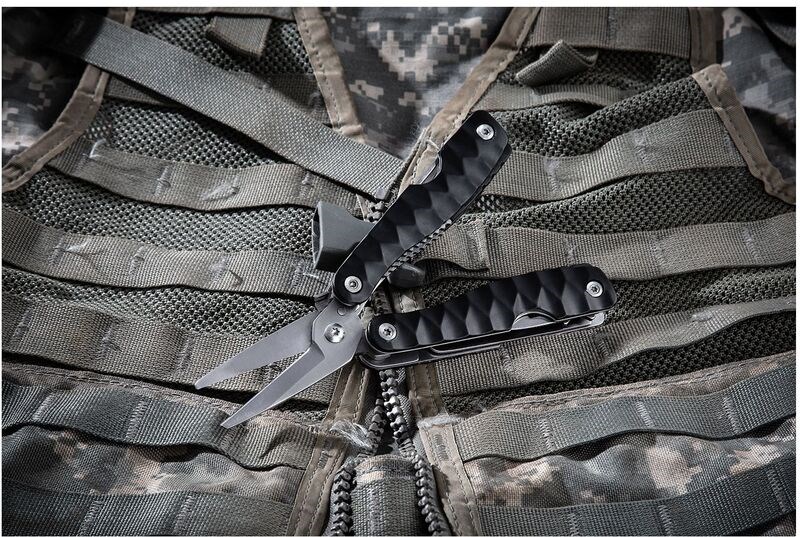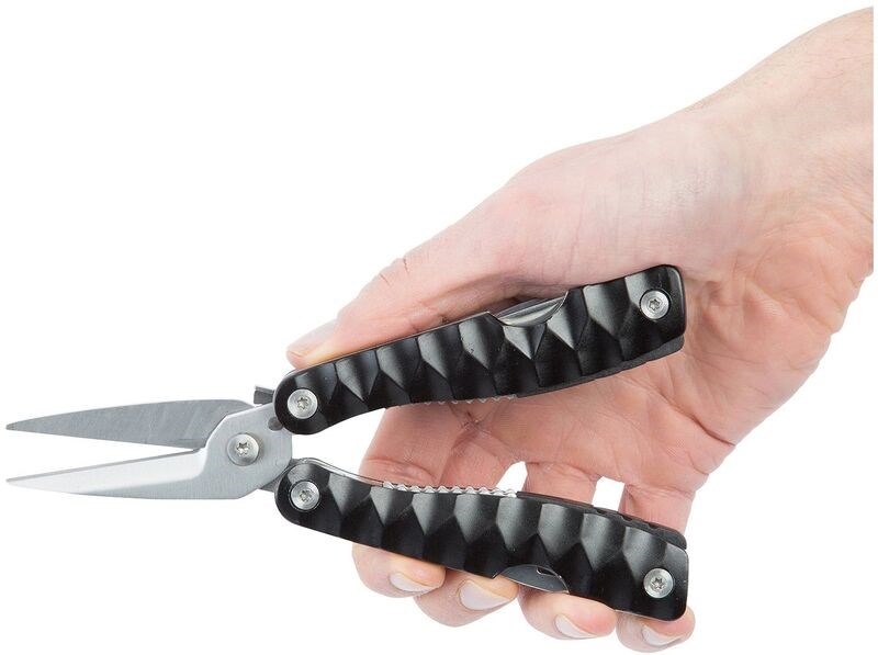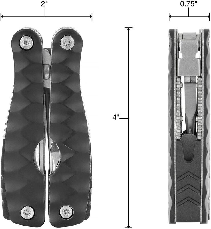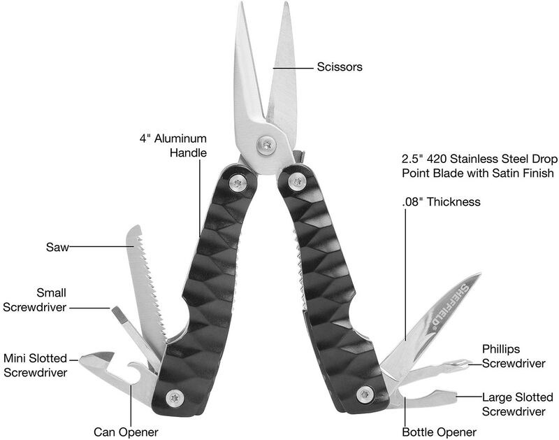 Features: scissors, 2.5" drop point blade, Phillips screwdriver, bottle opener, can opener, mini slotted screwdriver and saw