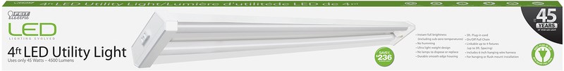 - 4 foot long shop light uses only 45 watts to deliver 4,500 lumens of instant full brightness