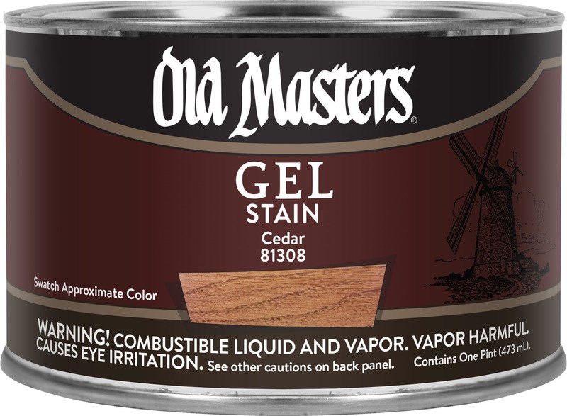 OLD MASTERS GEL STAIN - CEDAROld Masters Gel Stain in Cedar is an oil-based gel stain formulated for use on wood, fiberglass, metal, and composition surfaces. The thick gel formula prevents drips and runs, making it ideal for vertical surfaces and hard-to-stain woods like pine, birch, maple, poplar, and cherry. Cedar produces a warm, reddish-orange tone that replicates the look of natural cedar wood.